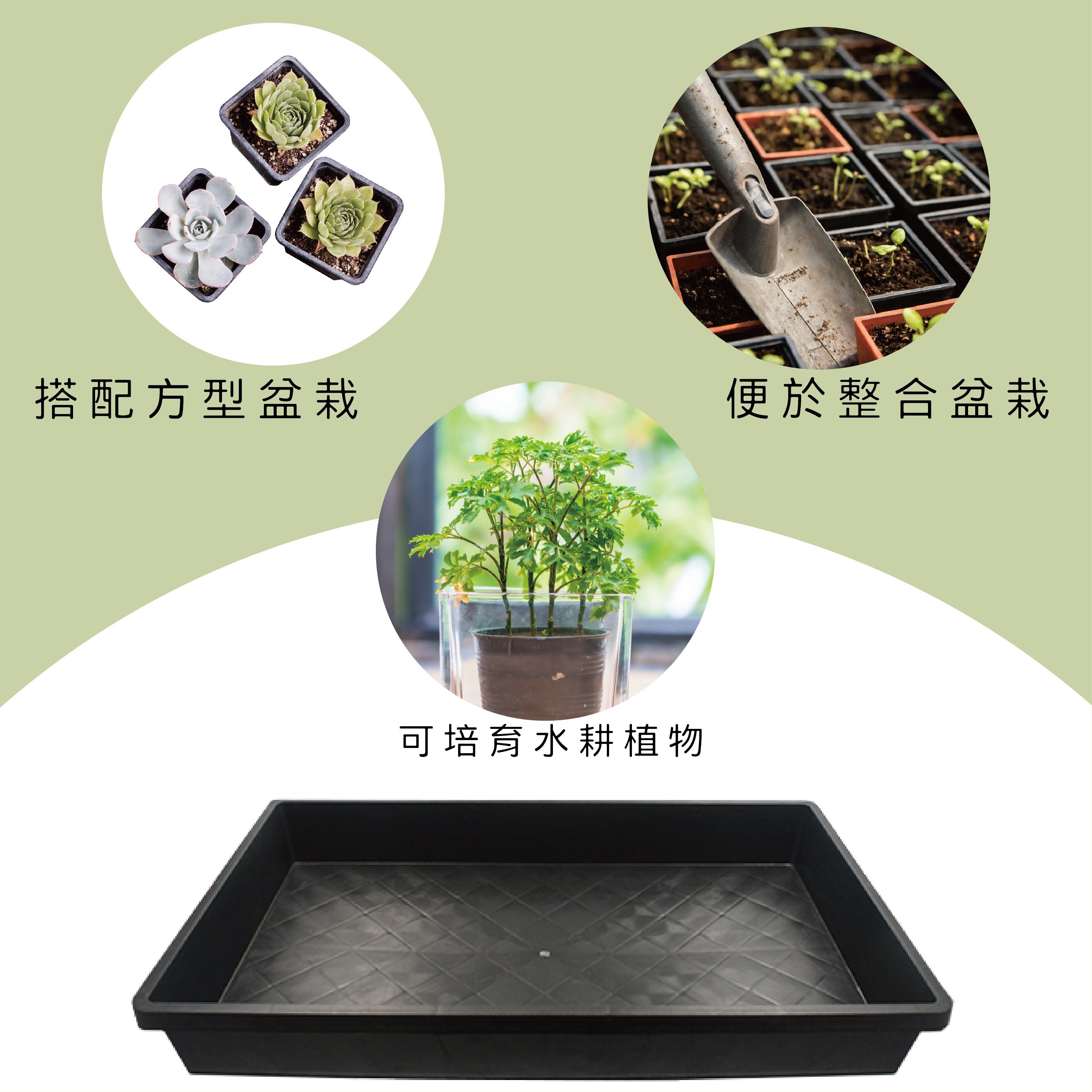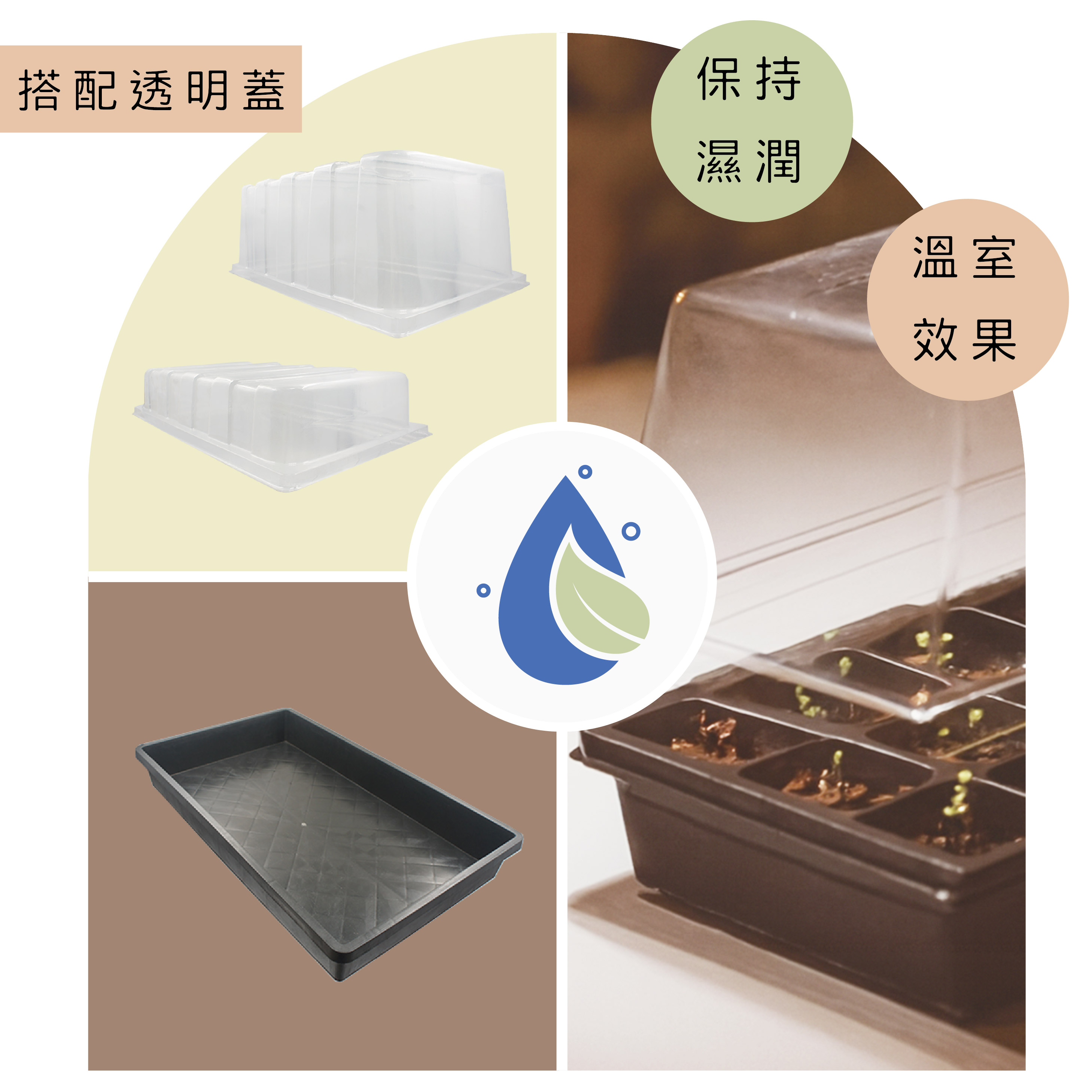 ◆ 無孔育苗盤可作為儲水盤;亦可搭配透明悶箱蓋,作為溫室、保溫盒使用。